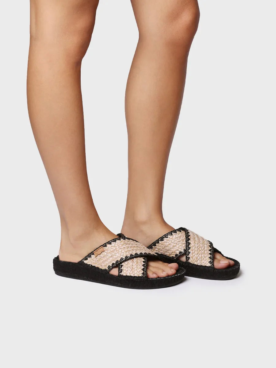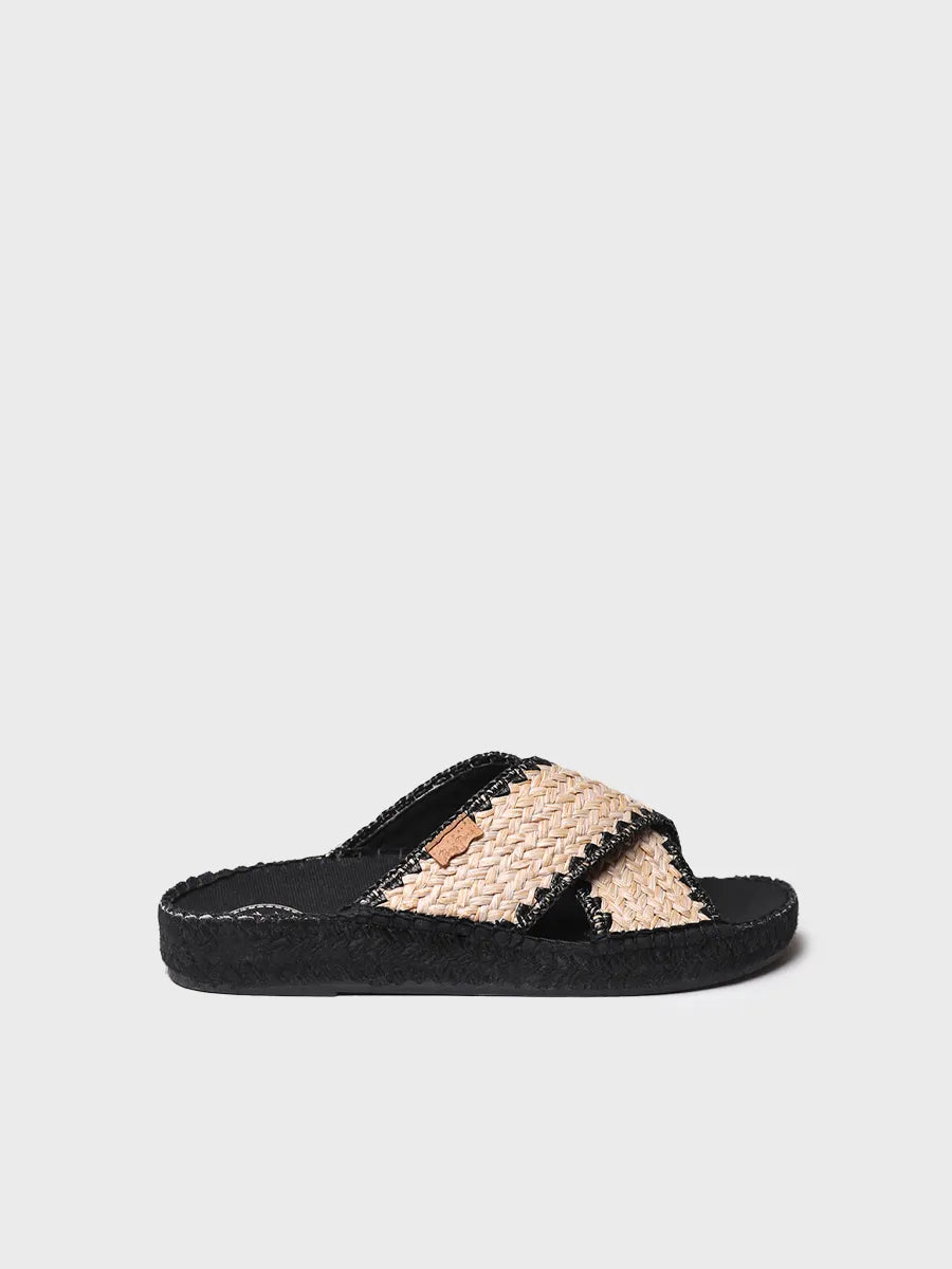 BERTA-IP. This flat women's espadrille is made from woven paper fabric. It is a backless design with two crossed straps on the upper that ensure a perfect fit to the foot. It features a padded insole made of cotton fabric. The jute sole is 2 cm high and is dyed black. It is a vegan design