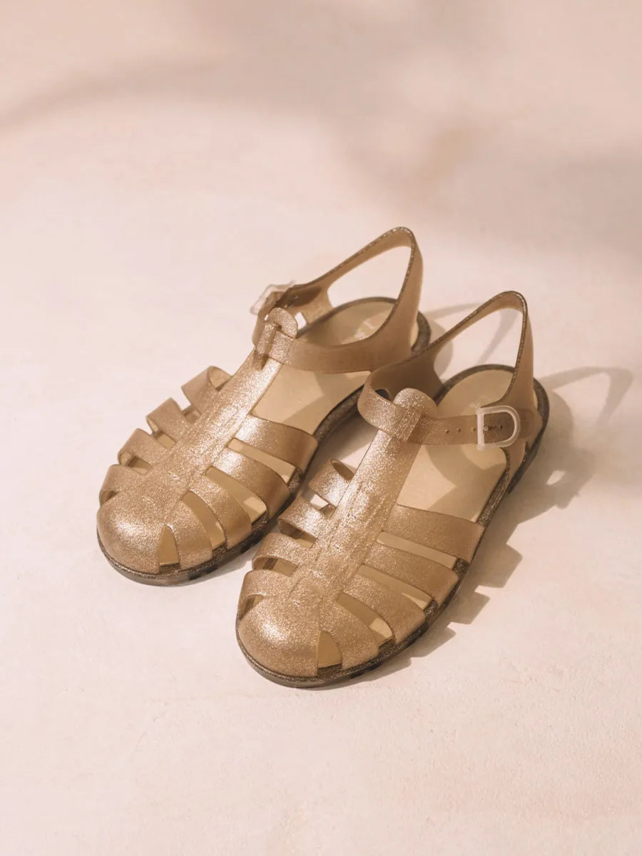 CALA. These women's rubber fisherman sandals are available with a glitter finish. They have an adjustable side buckle closure. These sandals have a rubber insole. It is a vegan and waterproof model.