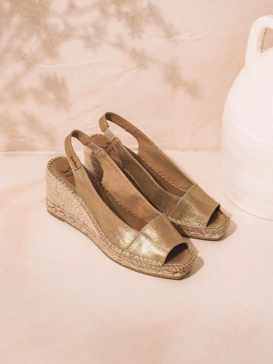 FIORE. This wedge espadrille is made of fabric with a jute wedge dyed to match. It is a model with an open toe and heel. The jute wedge has a total height of 7.5 cm, of which 5 cm belong to the heel and 1.5 cm to the sole. The insole is padded for greater comfort and the base of the sole is made of non-slip rubber. It features a back strap with an elastic to fit perfectly to the foot. It is a vegan model