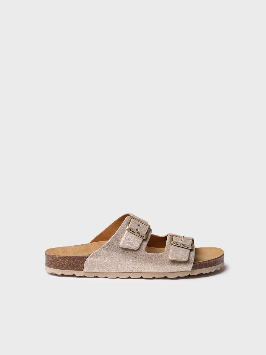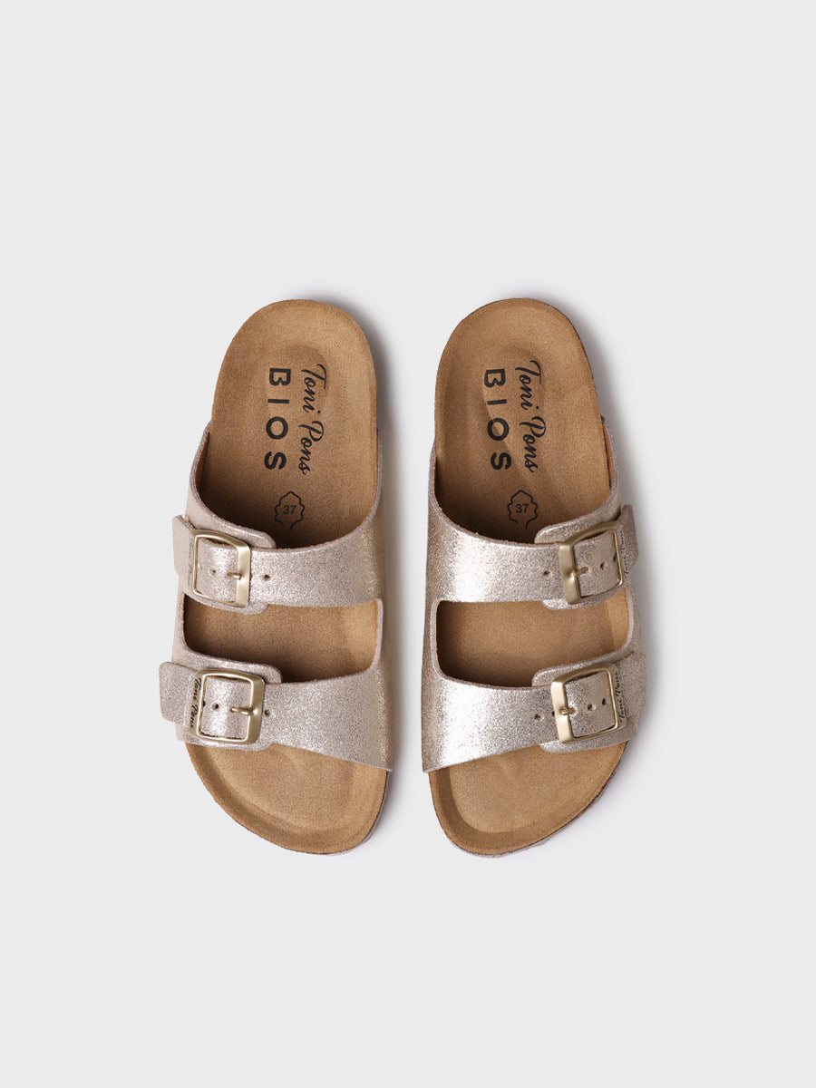 GHANA-QT. This women's sandal with BIO buckles is made from split leather. The cork and EVA sole have a total height of 3 cm. The inner sole is lined with breathable fabric for added comfort. It has two top straps with adjustable buckles for maximum support. This model fits true to size; if you are between two, we recommend choosing the smaller size.